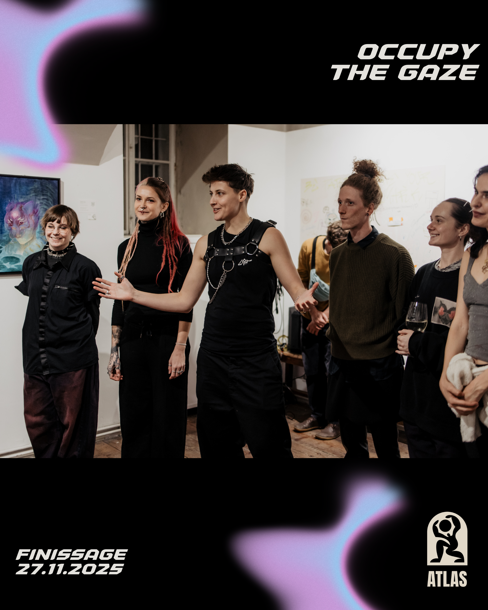 Ich organisiere Ausstellungen und Kunst-Events, in denen ich meine eigenen Werke gemeinsam mit anderen Künstler*innen präsentiere und eine stärkende, empowernde Bühne für die queere und FLINTA-Community schaffe. Die Eröffnungen werden durch DJs, Performances sowie optional Workshops und Touren bereichert.